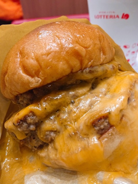 肉の階段からチーズが流れ落ちるロッテリア 4 Dan 絶品チーズバーガー